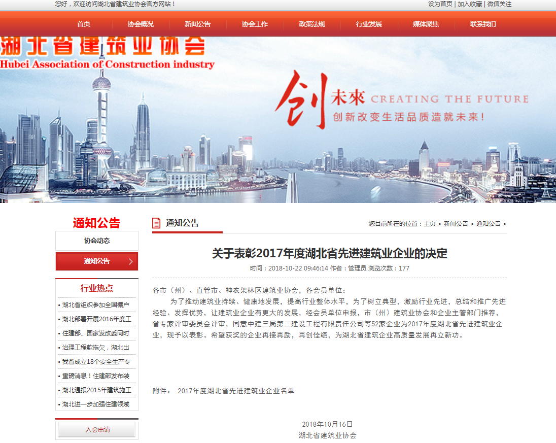 為了推動建筑業持續、健康地發展,提高行業整體水平,為了樹立典型,激勵行業先進,總結和推廣先進經驗、發揮優勢,讓建筑業企業有更大的發展,經會員單位申報,市(州)建筑業協會和企業主管部門推薦,省專家評審委員會評審,同意中建三局第二建設工程有限責任公司等52家企業為2017年度湖北省先進建筑業企業,現予以表彰。希望獲獎的企業再接再勵,再創佳績,為湖北省建筑企業高質量發展再立新功。