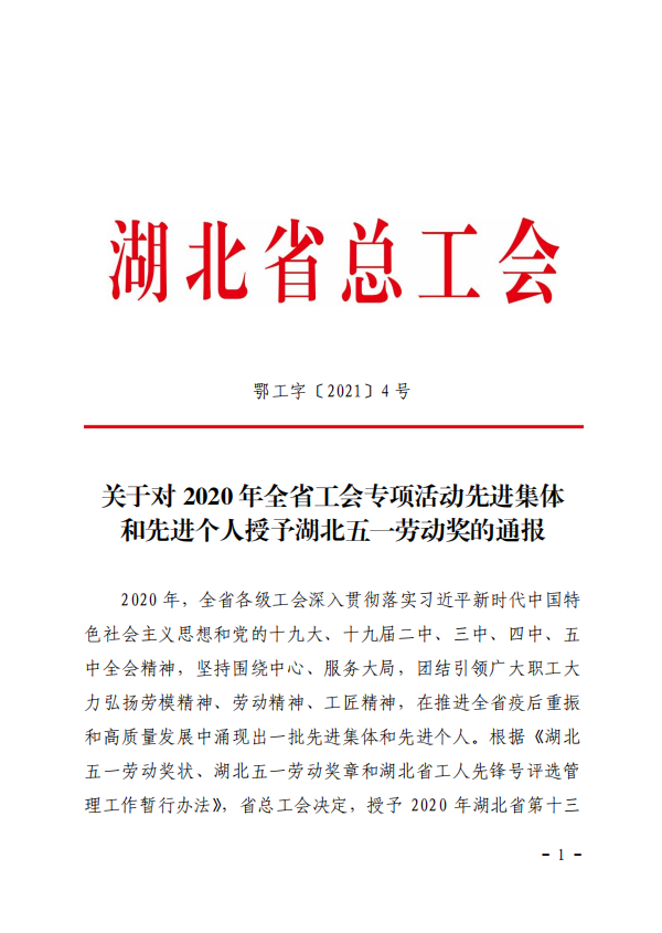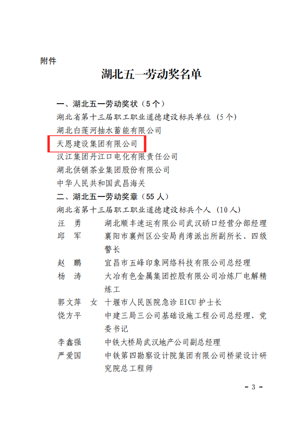 近日,從湖北省總工會《關于對?2020?年全省工會專項活動先進集體和先進個人授予湖北五一勞動獎的通報》中獲悉,在2020年湖北省總工會組織開展的“職工職業道德建設”專項活動中,天恩建設集團有限公司取得優異成績,榮獲“湖北五一勞動獎狀”。